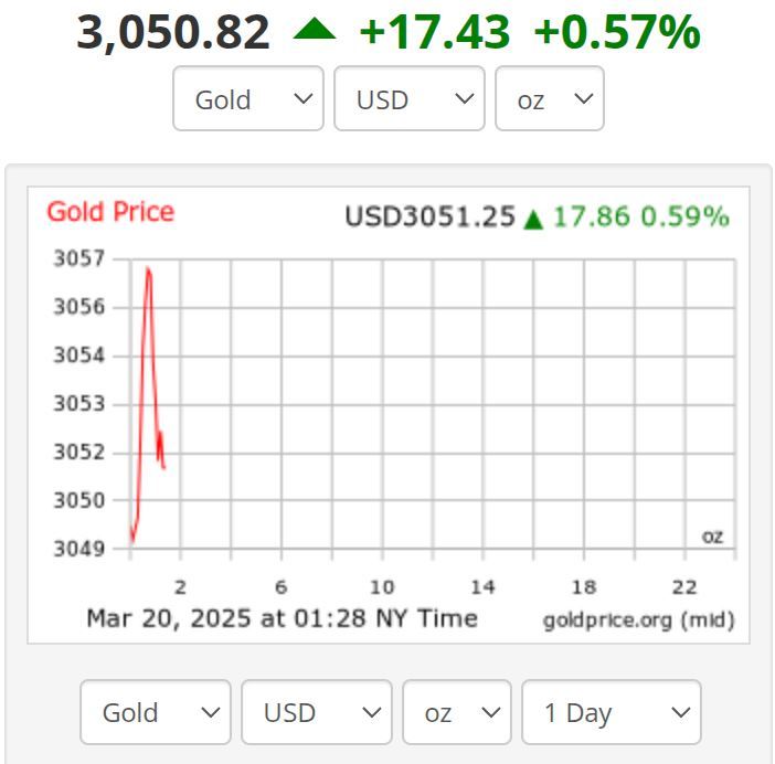 △當(dāng)?shù)貢r(shí)間20日開盤后,紐約商品交易所現(xiàn)貨黃金價(jià)格一度接近每盎司3057美元(圖自國(guó)際金價(jià)網(wǎng)站)