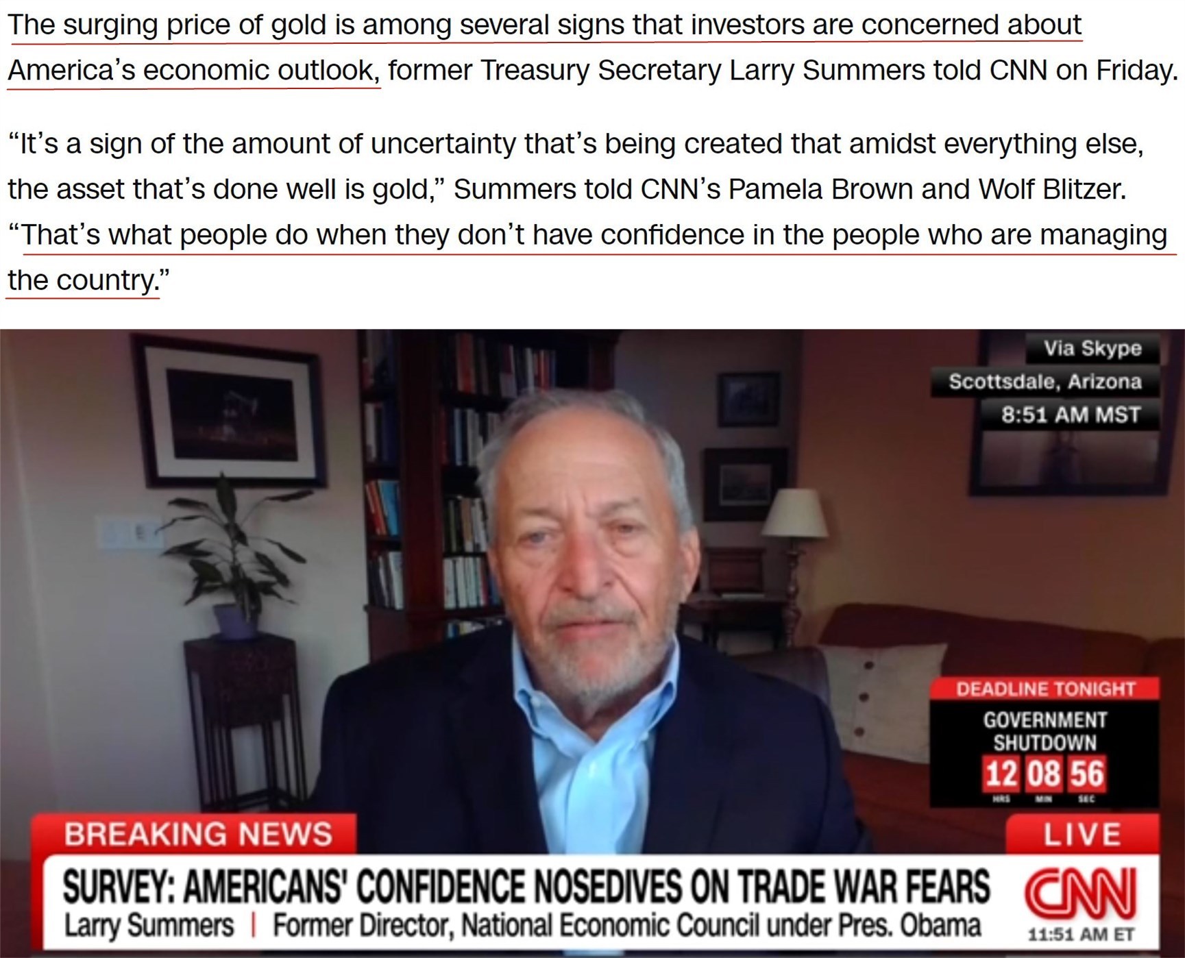 美國(guó)前財(cái)政部長(zhǎng)勞倫斯·薩默斯在接受采訪時(shí)表示,特朗普反復(fù)無常的政策和言行正在侵蝕全球市場(chǎng)對(duì)美元的信任,金價(jià)的大漲正是這種不確定性的體現(xiàn)。