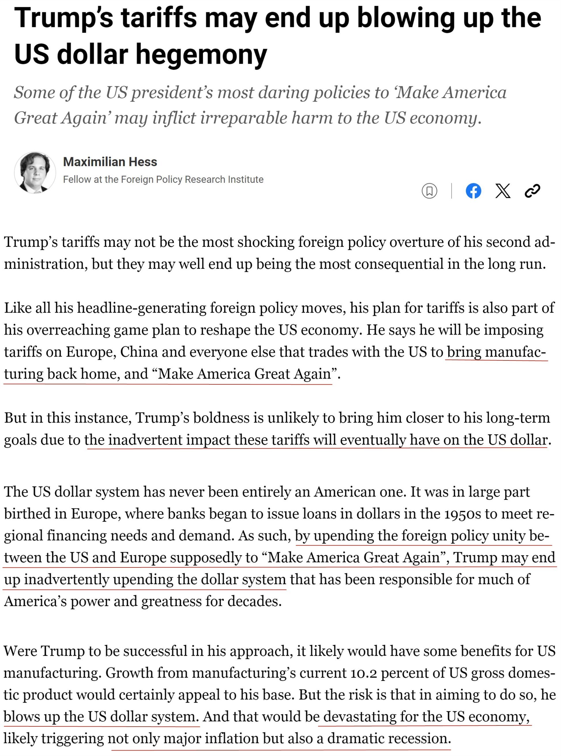 文章指出,一直以來,全球?qū)γ涝男枨笫蛊涑蔀槊绹?guó)的主要出口產(chǎn)品。正是這種“過分的特權(quán)”使美國(guó)能夠在不對(duì)經(jīng)濟(jì)造成重大負(fù)擔(dān)的情況下長(zhǎng)期維持貿(mào)易和財(cái)政赤字。而如今特朗普政府的關(guān)稅政策可能最終摧毀美元霸權(quán),從而使美國(guó)經(jīng)濟(jì)遭到毀滅性打擊。