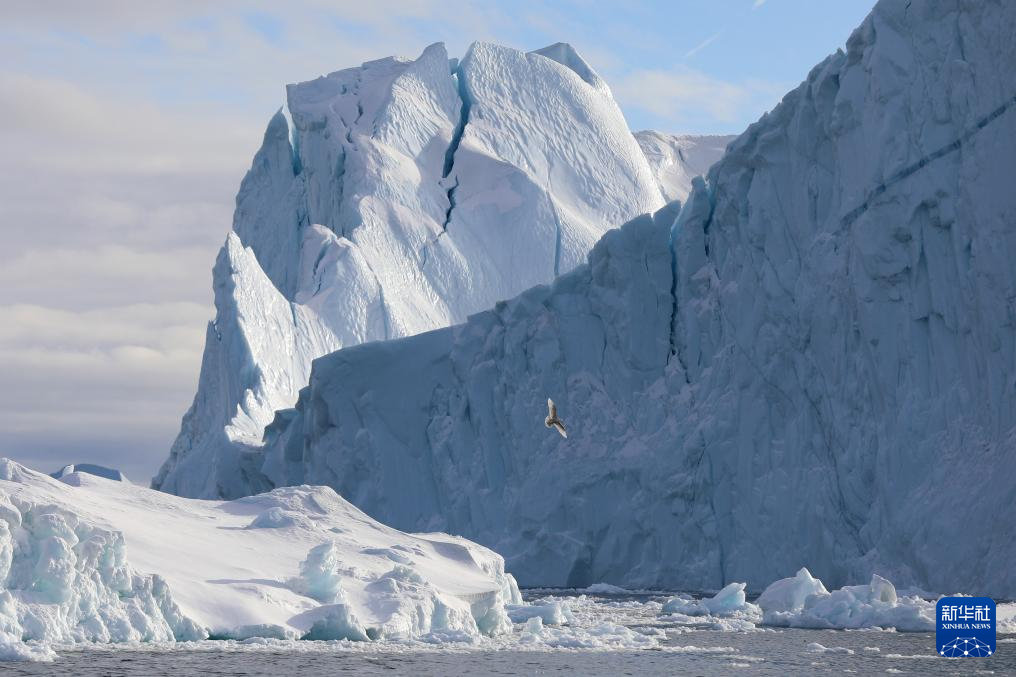 3月22日,在丹麥自治領地格陵蘭島迪斯科灣,一只海鳥從冰山旁飛過。新華社記者 趙丁喆 攝