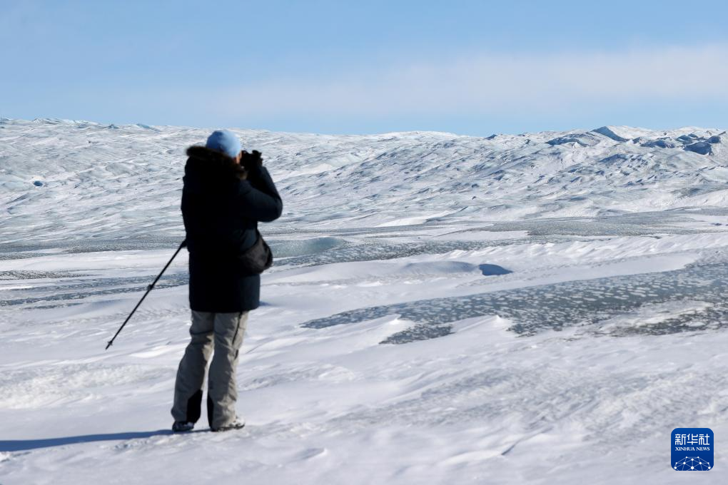 3月21日,在丹麥自治領地格陵蘭島中部的南斯特倫菲尤爾附近,一名男子在拍攝冰蓋。新華社記者 趙丁喆 攝