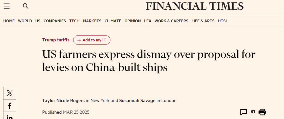 另據(jù)英國《金融時報》報道,美國中西部農(nóng)民非常擔(dān)憂,加征“港口費”必將進(jìn)一步削弱農(nóng)產(chǎn)品出口競爭力。美國大豆出口委員會首席執(zhí)行官吉姆·薩特表示,整個行業(yè)對提案“措手不及”。