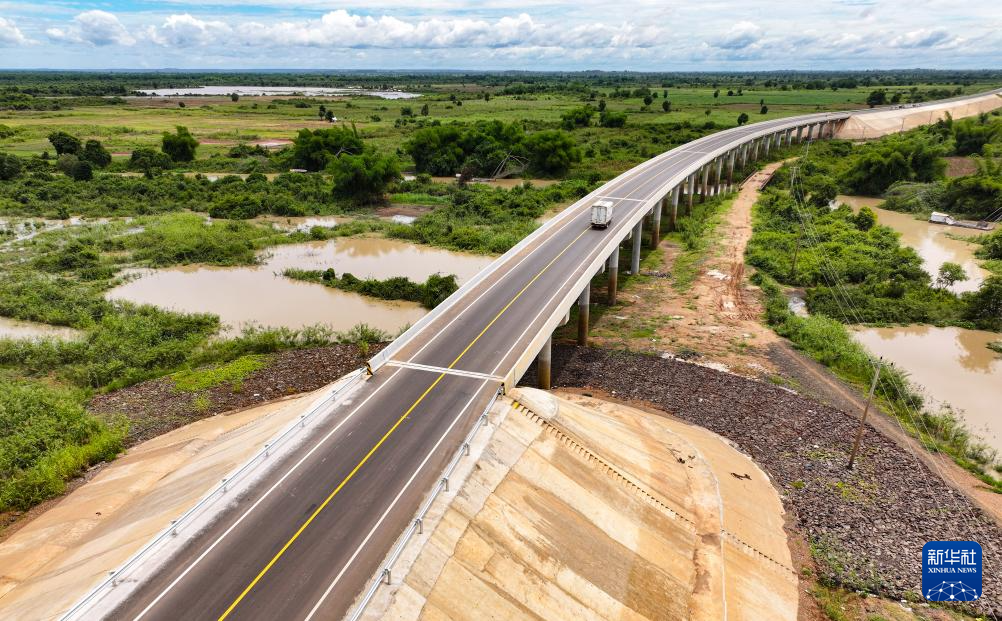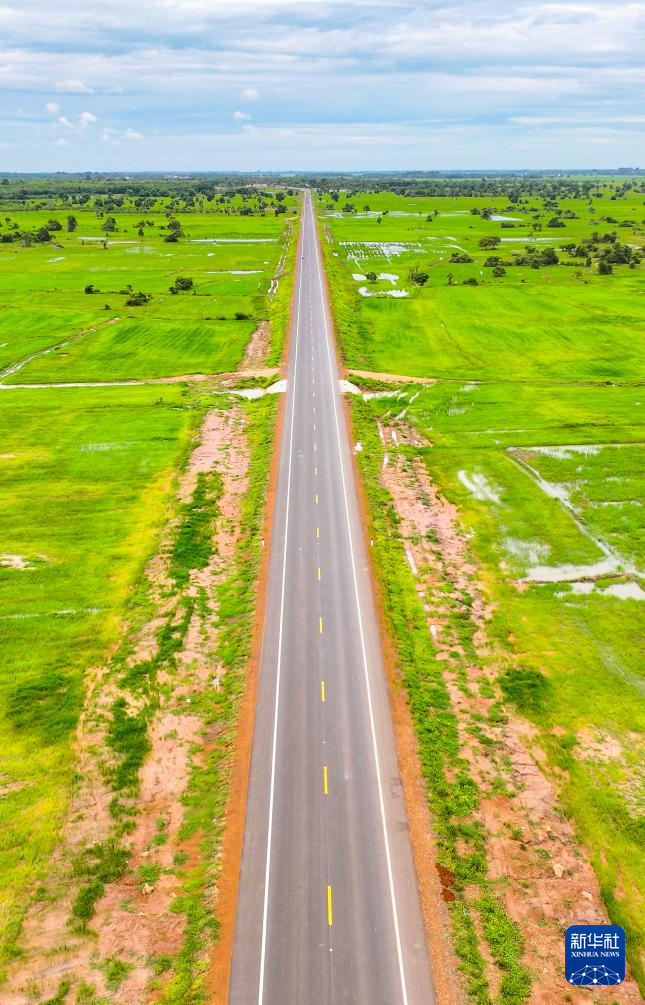 這是2024年7月14日在柬埔寨特本克蒙省拍攝的71C號(hào)國(guó)家公路(無(wú)人機(jī)照片)。新華社發(fā)(尼多拉攝)