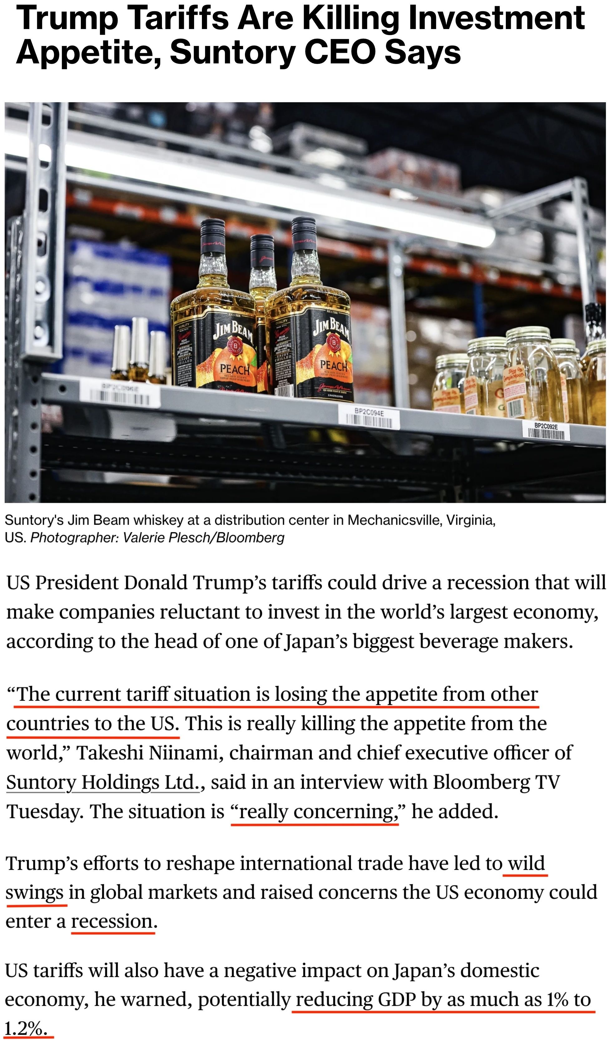 日本首相辦公室高級經濟顧問、日本最大飲料制造商之一三得利公司董事長兼首席執(zhí)行官新浪剛史22日接受彭博社采訪時警告,美國的關稅措施已導致全球市場劇烈波動,可能引發(fā)美國經濟衰退,并削弱其他國家對美國的投資意愿。