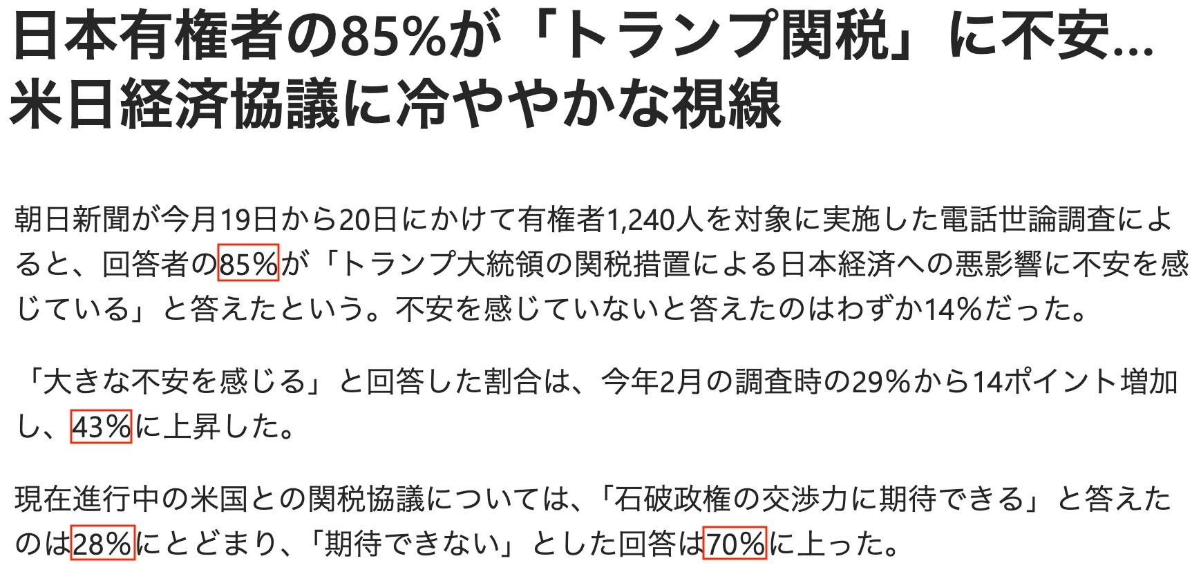 另據日本《朝日新聞》19日至20日進行的民調,多達85%的日本受訪者擔憂特朗普政府的關稅會對日本經濟產生負面影響,其中43%的受訪者表示非常擔憂。