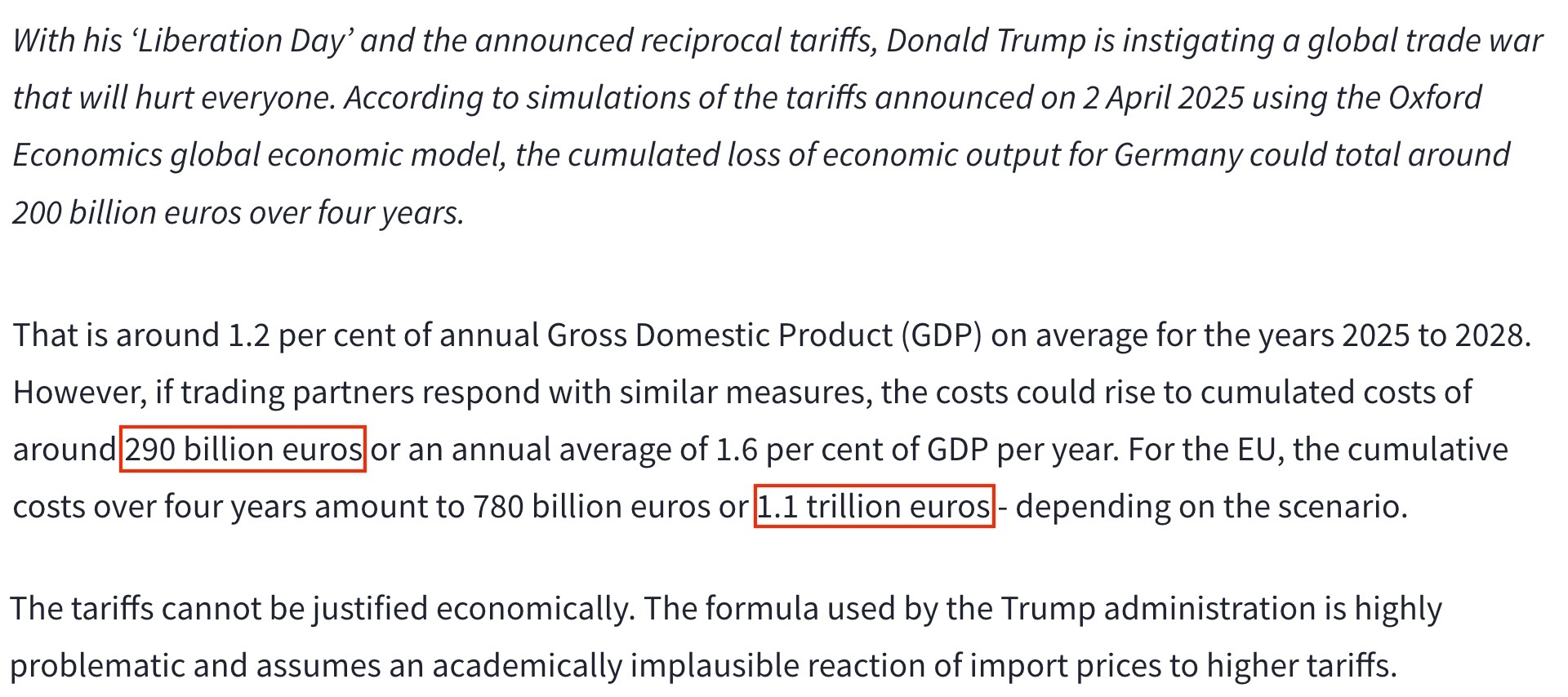 德國經濟研究所日前發(fā)布的研究報告顯示,未來四年內,美國“對等關稅”措施可能令歐盟損失1.1萬億歐元,僅德國就將損失2900億歐元。
