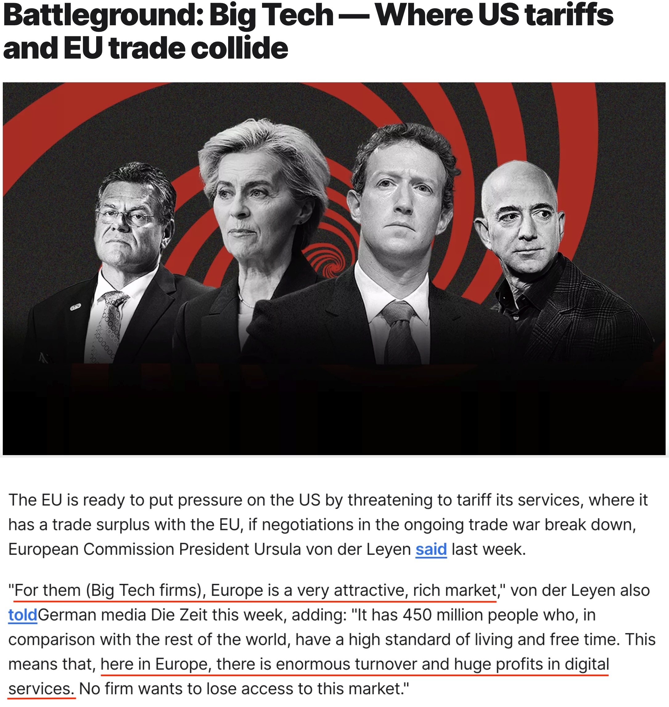 歐盟委員會主席馮德萊恩近日接受歐洲媒體采訪時表示,如果與美國的談判無法讓其取消對歐關稅,歐盟準備動用“最有力的貿易措施”將大西洋兩岸的貿易戰(zhàn)擴大到服務領域,包括對美國大型科技公司的數字廣告收入征稅、限制美國公司參與歐盟公共采購項目等。