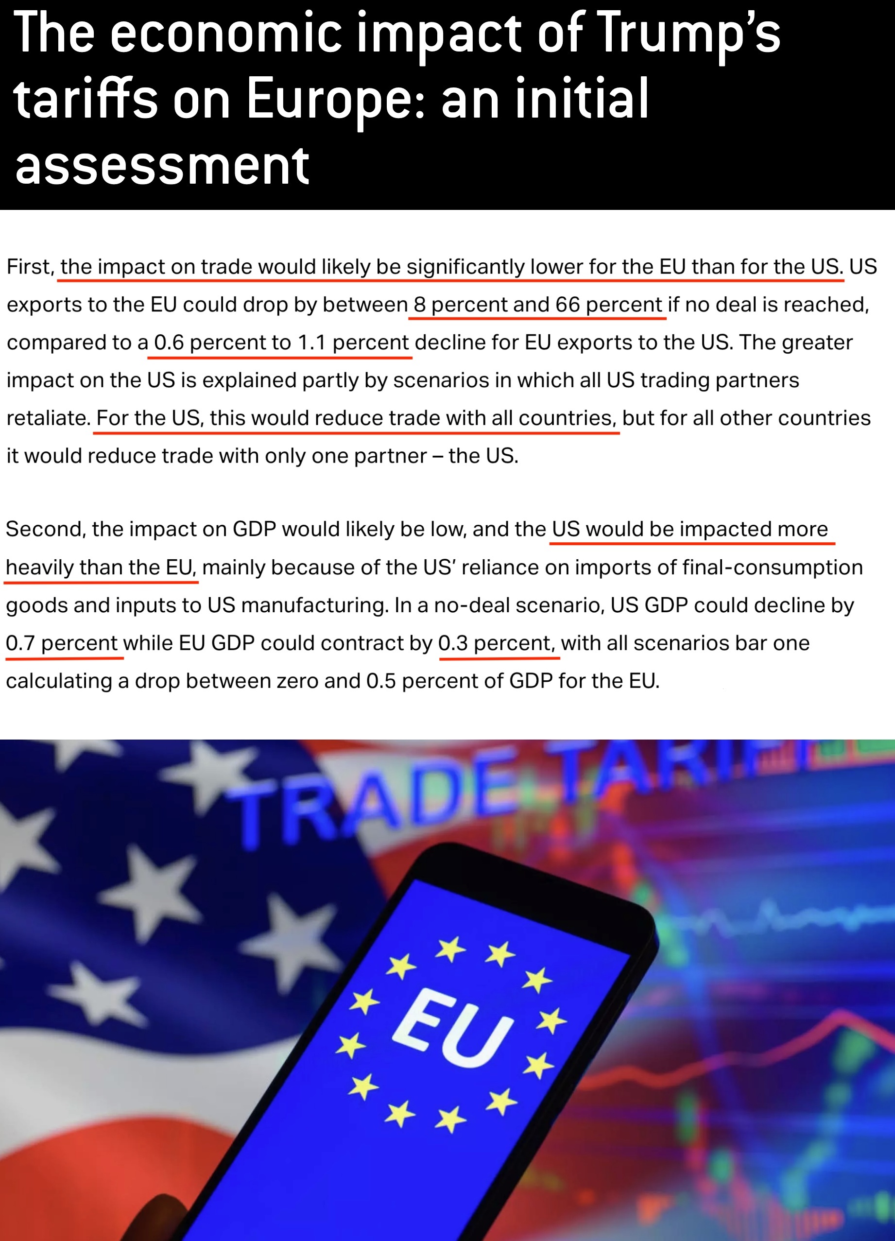至于關稅對國內生產總值(GDP)的影響,美國也將比歐盟更嚴重。如果不能與歐盟達成關稅協議,美國的GDP可能下降0.7%,而歐盟的GDP則可能僅下降0.3%。