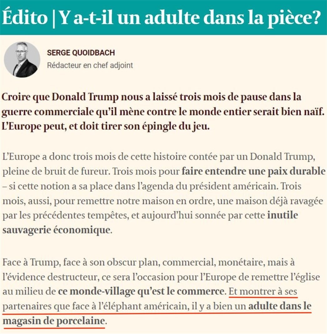 比利時《回聲報》近日發(fā)表評論文章指出,面對反復無常的特朗普政府,歐洲不應存有任何幻想,而應“直面美國帶來的喧囂與動蕩”,做好自己的事。
