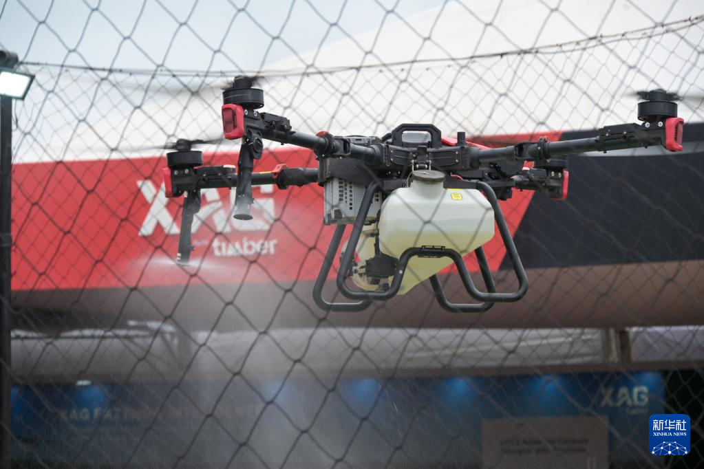 4月29日,在巴西圣保羅州里貝朗普雷圖市舉行的2025年巴西農(nóng)業(yè)科技展上,一架極飛農(nóng)業(yè)無人機(jī)進(jìn)行噴灑演示。新華社記者 陳昊佺 攝