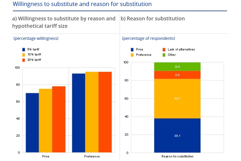 歐洲央行在4月底的博文中還提到,通常情況下,關(guān)稅對消費(fèi)者的影響程度取決于受影響產(chǎn)品和服務(wù)的需求價格彈性,即如果價格上漲,消費(fèi)者可能會轉(zhuǎn)向更便宜的替代品。然而,近期美國的關(guān)稅可能會導(dǎo)致更廣泛的偏好轉(zhuǎn)變,使歐洲人完全放棄美國產(chǎn)品和品牌,不論價格如何變化。