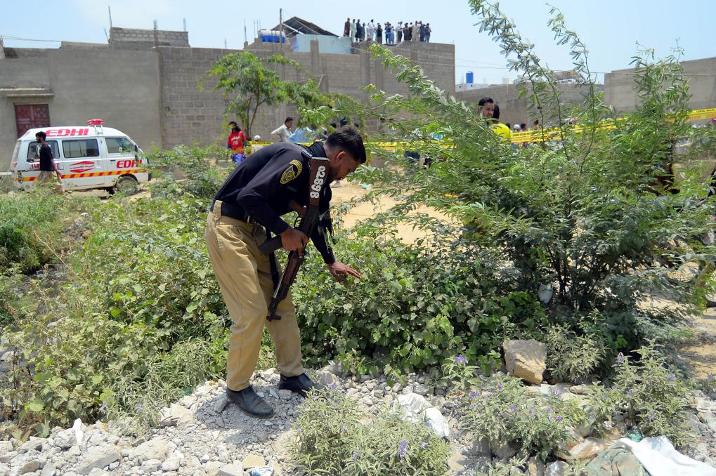 2025年5月8日,在巴基斯坦卡拉奇,安全人員檢查印度無人機(jī)襲擊現(xiàn)場附近區(qū)域。新華社發(fā)