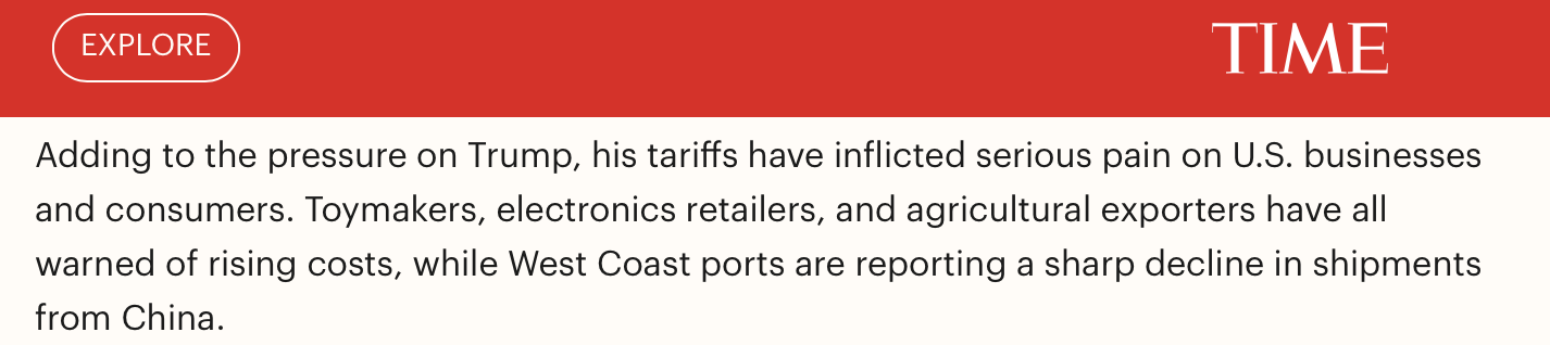 報(bào)道同時(shí)指出,美國政府的關(guān)稅措施給美國企業(yè)和消費(fèi)者帶來了沉重打擊,這進(jìn)一步加劇了美國政府的壓力。玩具制造商、電子產(chǎn)品零售商和農(nóng)產(chǎn)品出口商都警告稱,成本將上升,而美國西海岸的港口則報(bào)告稱,來自中國的貨運(yùn)量急劇下降。