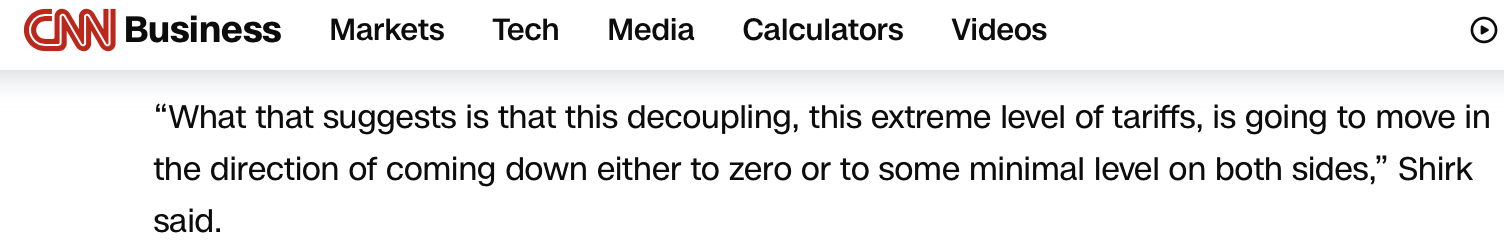 美國有線電視新聞網(wǎng)的報(bào)道注意到美國財(cái)政部長貝森特此前關(guān)于“本周末的談判將側(cè)重于緩和緊張局勢(shì)”的表態(tài)。報(bào)道援引加州大學(xué)圣迭戈分校全球政策與戰(zhàn)略學(xué)院研究教授、21世紀(jì)中國研究中心名譽(yù)主任蘇珊·希爾克的觀點(diǎn)指出,這表明美中之間“脫鉤、極端的關(guān)稅水平,將朝著降至零,或是降至最低水平的方向發(fā)展”。