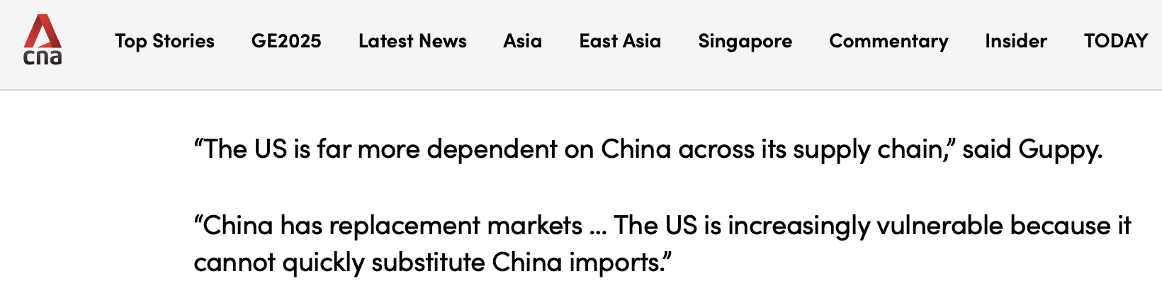 報(bào)道稱,澳大利亞金融專欄作家戴若·顧比表示,“美國整個(gè)供應(yīng)鏈對(duì)中國的依賴程度要高得多”,“中國有替代市場(chǎng)……美國則越來越脆弱,因?yàn)樗鼰o法迅速找到中國進(jìn)口產(chǎn)品的替代品”。
