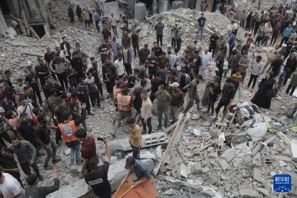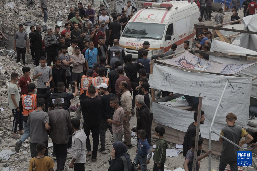 5月15日,在加沙地帶北部杰巴利耶難民營,人們在以軍轟炸后開展救援。新華社發(fā)(阿卜杜勒·拉赫曼·薩拉馬攝)