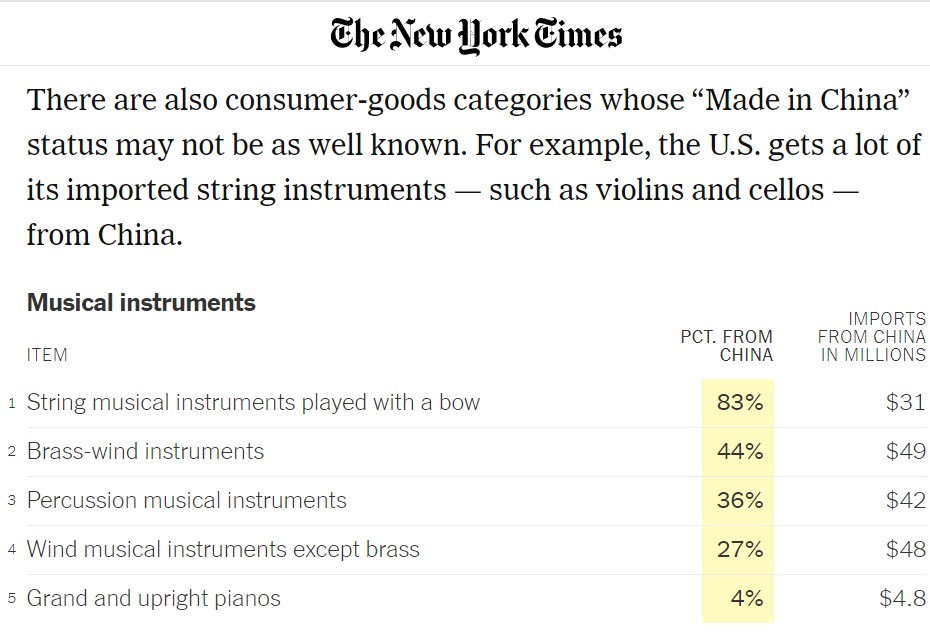 文章說,從清單中可以看出,美國從中國進(jìn)口的主要商品都是消費(fèi)品,覆蓋生活中的多個(gè)場景:你衣櫥中的領(lǐng)帶、手套和連褲襪幾乎都是從中國進(jìn)口的;如果你是一名運(yùn)動(dòng)員,尤其是球類運(yùn)動(dòng)的運(yùn)動(dòng)員,那么你用的羽毛球、乒乓球、網(wǎng)球、健身房設(shè)備、泳池設(shè)備等都非常依賴“中國制造”;還有一些消費(fèi)品類別的“中國制造”可能不那么廣為人知。例如,美國從中國進(jìn)口了大量弦樂器,包括小提琴和大提琴。維生素及其衍生物也大量從中國進(jìn)口,還有各種冷凍魚類,包括鰻魚、鱈魚、羅非魚等等。