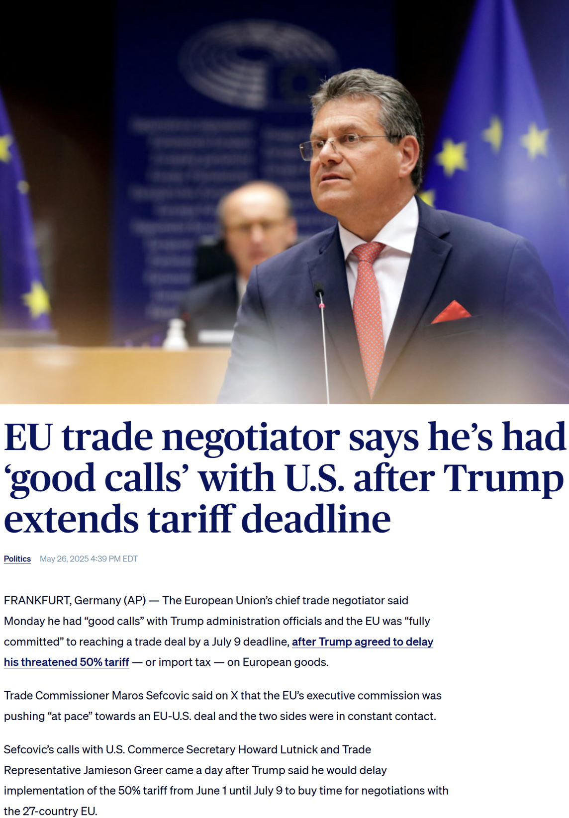 他25日告訴記者,自己當(dāng)天與歐盟委員會(huì)主席馮德萊恩“愉快”地通了電話,并應(yīng)對(duì)方要求,決定將原計(jì)劃從6月1日開(kāi)始對(duì)歐盟加征的50%的關(guān)稅推遲到7月9日,以便雙方有時(shí)間就此進(jìn)行談判。