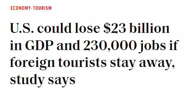 經(jīng)濟(jì)分析公司Implan首席經(jīng)濟(jì)學(xué)家珍妮弗·索瓦爾德森(Jennifer Thorvaldson)測(cè)算稱,基于3月份外國(guó)游客赴美人數(shù)下降的情況,若今年國(guó)際游客減少10%,不僅美國(guó)國(guó)內(nèi)生產(chǎn)總值(GDP)將損失230億美元,還會(huì)損失大約23萬(wàn)個(gè)工作崗位。