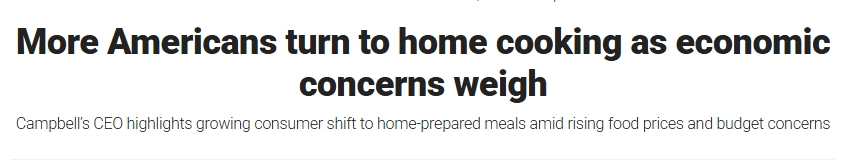 福克斯財經(jīng)(Fox Business)的報道援引了罐頭食品生產(chǎn)商金寶湯(Campbell's)首席執(zhí)行官米克·比克胡伊森的話稱,隨著經(jīng)濟擔(dān)憂加劇,更多美國家庭選擇在家烹飪以節(jié)省開支。他近期在其公司第三季度財報電話會議上告訴分析師,整個季度消費者情緒持續(xù)疲軟,購物者在食品支出上變得更加謹(jǐn)慎。