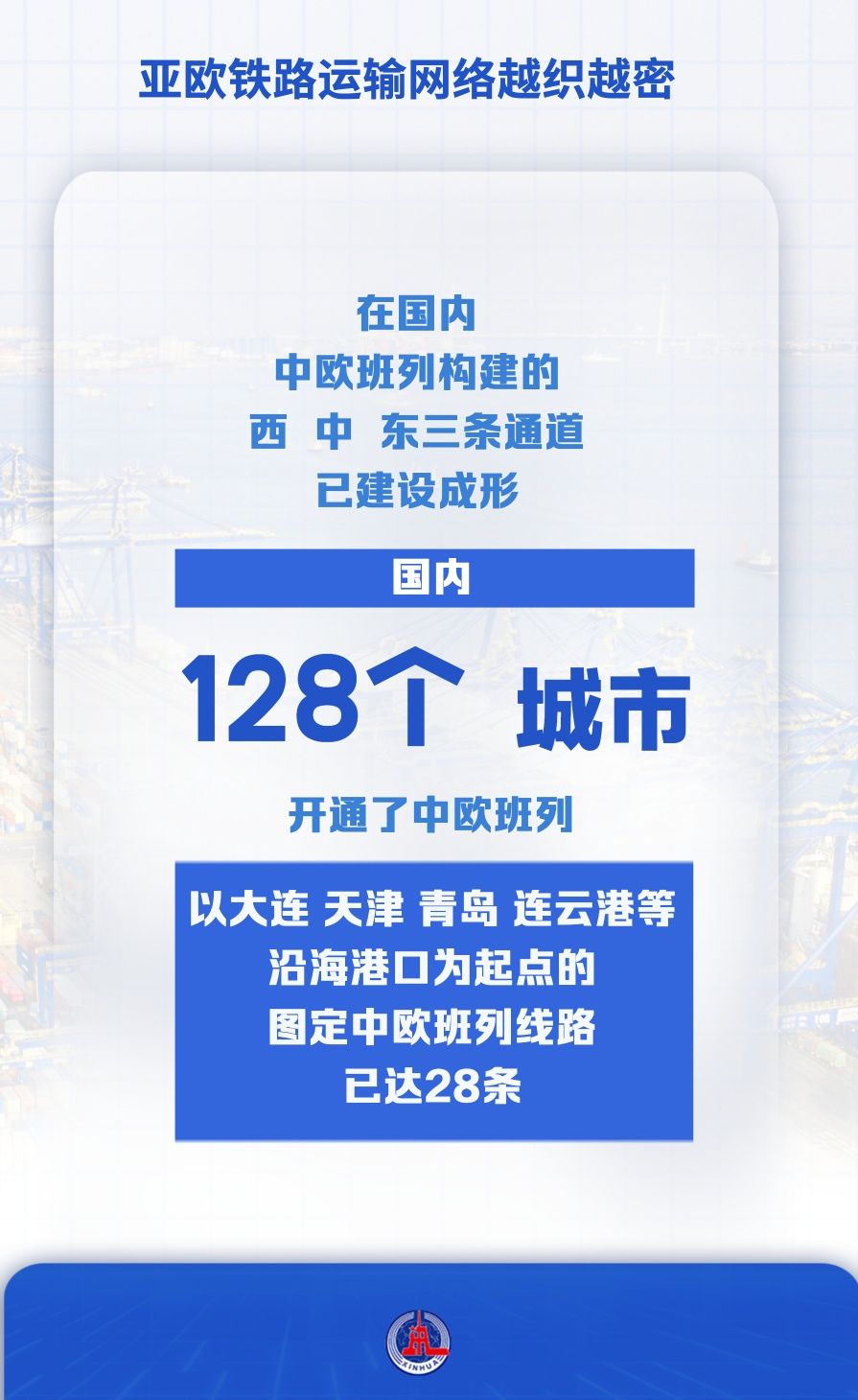 在國內,中歐班列構建的西、中、東三條通道已建設成形,國內128個城市開通了中歐班列,以大連、天津、青島、連云港等沿海港口為起點的圖定中歐班列線路已達28條。