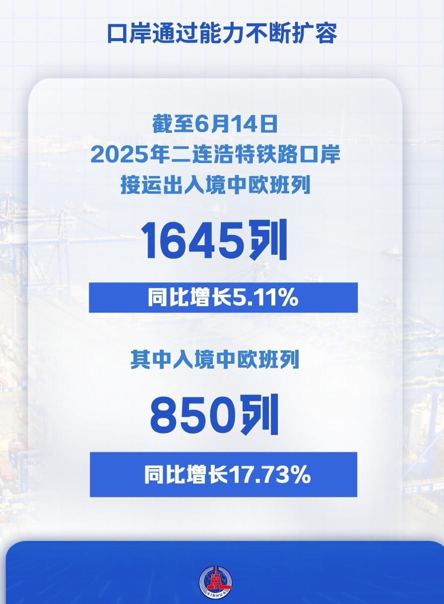 二連浩特口岸是中歐班列中通道進出境的唯一鐵路口岸,截至6月14日,2025年二連浩特鐵路口岸接運出入境中歐班列1645列,同比增長5.11%,其中入境中歐班列850列,同比增長17.73%。