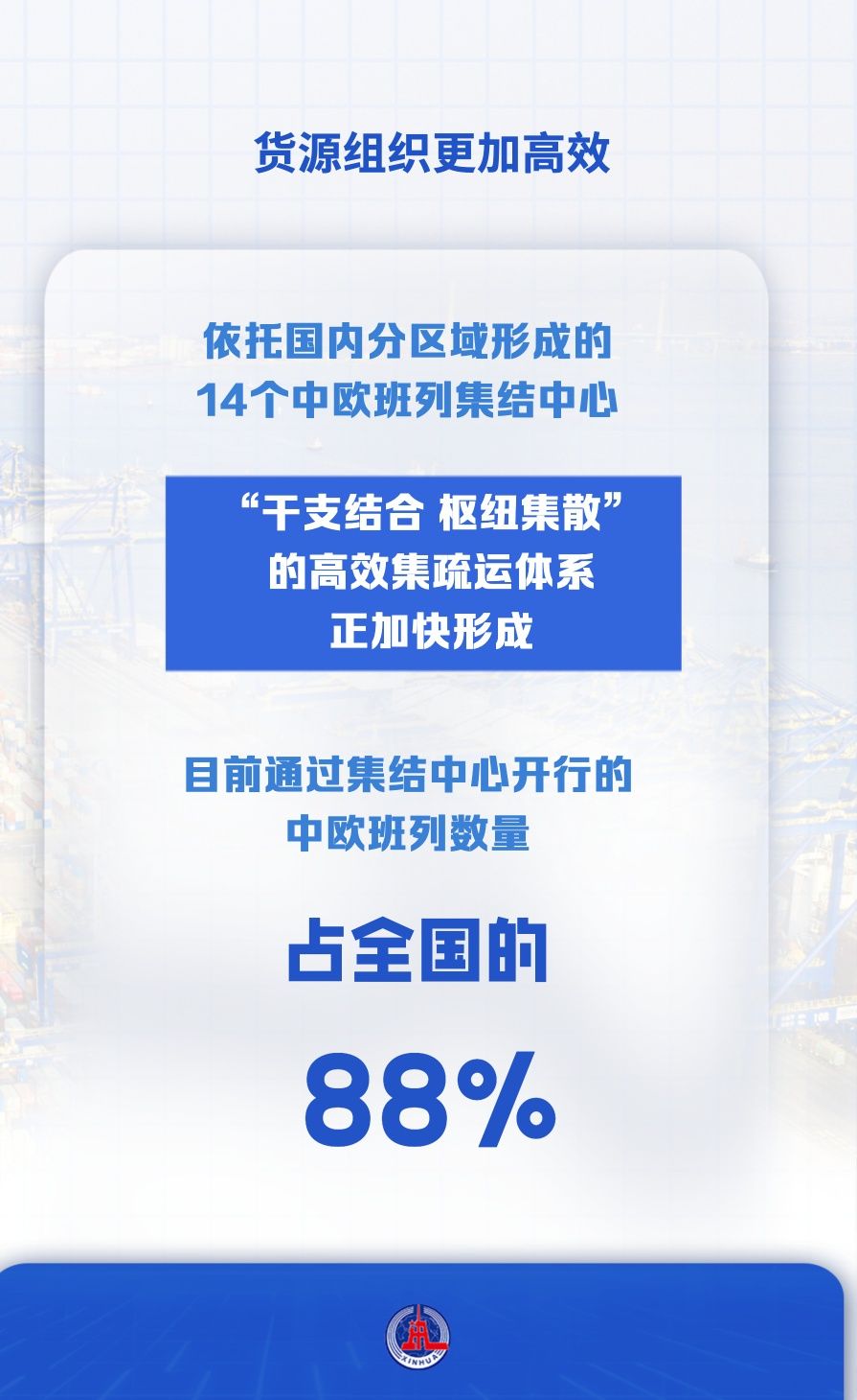 依托國內分區(qū)域形成的14個中歐班列集結中心,“干支結合、樞紐集散”的高效集疏運體系正加快形成,目前通過集結中心開行的中歐班列數(shù)量占全國的88%。