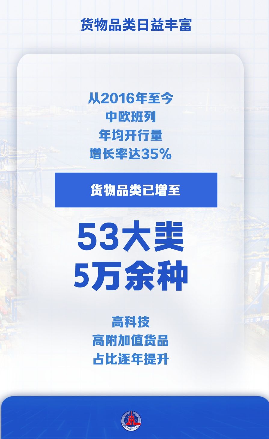 從2016年至今,中歐班列年均開行量增長率達35%,貨物品類已增至53大類5萬余種,高科技、高附加值貨品占比逐年提升。