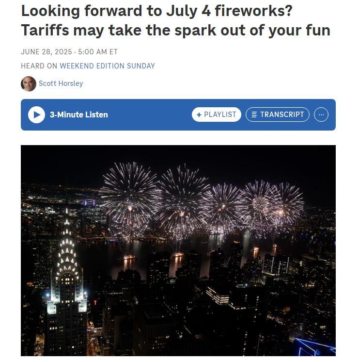 文章說,美國煙花協(xié)會執(zhí)行董事朱莉·赫克曼表示:“中國是全球煙花供應(yīng)國。美國市場上99%的家庭庭院煙花和90%的專業(yè)表演煙花都產(chǎn)自中國??梢哉f,中國幾乎是我們唯一的貨源?!比欢捎陉P(guān)稅,很多美國經(jīng)銷商停止了煙花進口,赫克曼建議消費者盡早購買煙花,以免斷貨。