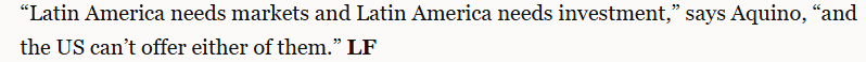 文章指出,并非所有人都對(duì)拉美與中國之間的合作感到滿意。華盛頓尤其擔(dān)心。不過,許多人認(rèn)為華盛頓影響拉丁美洲的能力有限。文章援引利馬國立圣馬科斯大學(xué)的亞洲經(jīng)濟(jì)專家卡洛斯·阿基諾的話指出,“拉丁美洲需要市場和投資,但美國無法提供其中任何一項(xiàng)”。