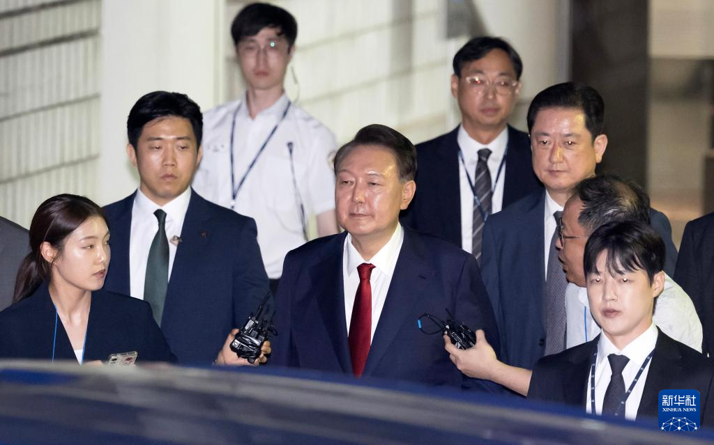 7月9日晚,韓國前總統(tǒng)尹錫悅接受訊問后走出首爾中央地方法院。新華社/紐西斯通訊社