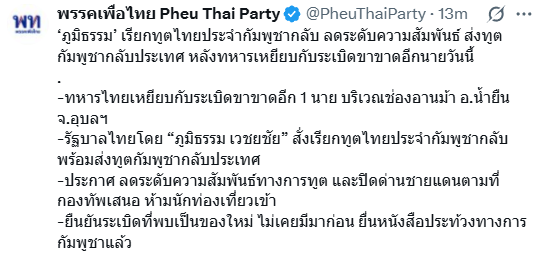 泰國(guó)執(zhí)政黨為泰黨23日發(fā)布聲明表示,一名泰國(guó)士兵當(dāng)天在泰柬邊境觸發(fā)地雷而受傷,泰方因而決定降低雙方的外交關(guān)系等級(jí)。按照泰國(guó)外交部的說(shuō)法,致泰國(guó)士兵受傷的地雷系柬方新布設(shè),泰方已就此向柬方提出正式抗議。