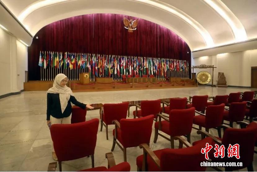 當?shù)貢r間2025年3月18日,在萬隆亞非會議紀念博物館內(nèi),工作人員展示中國代表團在1955年萬隆會議上的座席區(qū)域。 中新社記者 李志全 攝