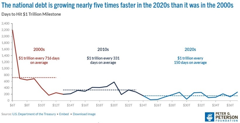 據(jù)其統(tǒng)計,在本世紀(jì)第一個十年,美債每增加1萬億美元平均需要近兩年(716天);在本世紀(jì)第二個十年,這一時間縮短到了不到一年(331天);而到了目前所處的本世紀(jì)第三個十年,美債平均不到半年(150天)就會跨越一個萬億美元級大關(guān)。