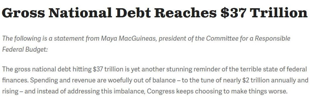 “(美國)國家債務(wù)總額達到37萬億美元的現(xiàn)實再次令人震驚地凸顯出聯(lián)邦財政的糟糕狀況。支出和收入嚴(yán)重失衡每年造成近2萬億美元的財政赤字,然而美國國會不僅沒有解決這種財政失衡,反而一直選擇讓事情變得更糟。”