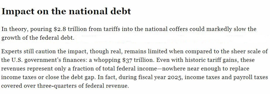 雖然美國政府確實從其濫施的關(guān)稅中“賺”了一筆,但專家們?nèi)匀痪嬷赋?,與37萬億美元的龐大美債規(guī)模相比,關(guān)稅收入實屬九牛一毛。即使加上歷史上的關(guān)稅收益,它們也只占聯(lián)邦總收入的一小部分,遠(yuǎn)不足以取代所得稅或縮小債務(wù)缺口。