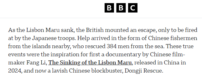 文章說,在這艘載有英軍戰(zhàn)俘的船只“里斯本丸”號沉沒過程中,英國戰(zhàn)俘組織突圍逃生,卻遭到日軍掃射。附近島嶼的中國漁民們伸出了援手,從海中救起384人。這一真實事件先后催生了兩部影視作品:紀錄片《里斯本丸沉沒》,以及電影《東極島》。