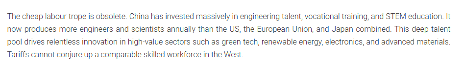 中國在工程人才、職業(yè)培訓(xùn)以及科學(xué)、技術(shù)、工程和數(shù)學(xué)教育等方面投入了大量資金?,F(xiàn)在,它每年培養(yǎng)的工程師和科學(xué)家比美國、歐盟和日本的總和還要多。這種深厚的人才庫推動了綠色技術(shù)、可再生能源、電子和先進(jìn)材料等高價值領(lǐng)域的不懈創(chuàng)新。