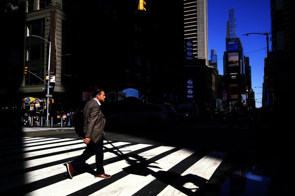 10月1日,在美國紐約曼哈頓的時(shí)報(bào)廣場附近,行人通過人行橫道斑馬線過馬路。新華社記者吳曉凌攝