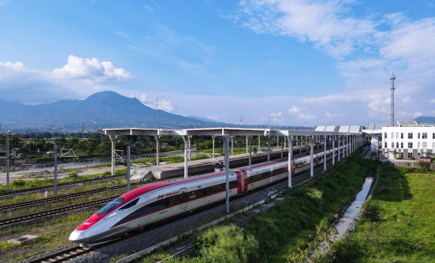 5月20日,在印度尼西亞萬(wàn)隆,一列雅萬(wàn)高鐵高速動(dòng)車(chē)組列車(chē)駛出德卡魯爾站(無(wú)人機(jī)照片)。新華社記者 徐欽 攝