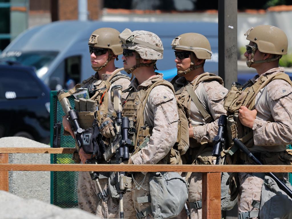 2025年6月13日,美國海軍陸戰(zhàn)隊士兵在洛杉磯威爾希爾聯邦大樓的入口處站崗。新華社發(fā)(邱晨攝)