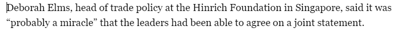半島電視臺也關(guān)注了此次峰會,報(bào)道援引新加坡欣里奇基金會貿(mào)易政策負(fù)責(zé)人黛博拉 埃爾姆斯的話說,各成員領(lǐng)導(dǎo)人能夠就聯(lián)合聲明達(dá)成一致是“了不起的事情”。他說,鑒于亞太經(jīng)合組織經(jīng)濟(jì)體的不同立場,要將任何達(dá)成一致的措辭寫入文件都是一項(xiàng)“充滿挑戰(zhàn)的工作”。