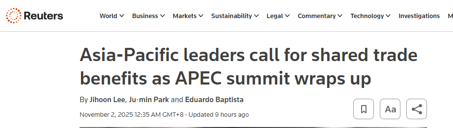 2025年亞太經(jīng)合組織(APEC)領(lǐng)導(dǎo)人非正式會議于10月31日至11月1日在韓國慶州舉行,會議發(fā)表了《慶州宣言》。多家外媒報(bào)道稱,會議凸顯了亞太地區(qū)經(jīng)濟(jì)體對自由貿(mào)易的承諾。