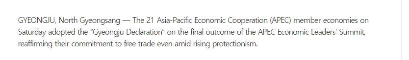 韓國《中央日報(bào)》報(bào)道稱,《慶州宣言》反映出此次APEC領(lǐng)導(dǎo)人峰會的最終成果,并重申了在保護(hù)主義抬頭 的背景下,各成員領(lǐng)導(dǎo)人對自由貿(mào)易的承諾。