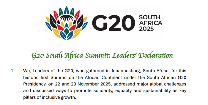 二十國集團(tuán)(G20)領(lǐng)導(dǎo)人第二十次峰會(huì)當(dāng)?shù)貢r(shí)間11月22日在南非約翰內(nèi)斯堡開幕。南非國際關(guān)系與合作部長羅納德·拉莫拉在當(dāng)天下午召開的記者發(fā)布會(huì)上表示,與會(huì)各方已就會(huì)議核心議程達(dá)成共識(shí),并通過了《二十國集團(tuán)領(lǐng)導(dǎo)人約翰內(nèi)斯堡峰會(huì)宣言》。