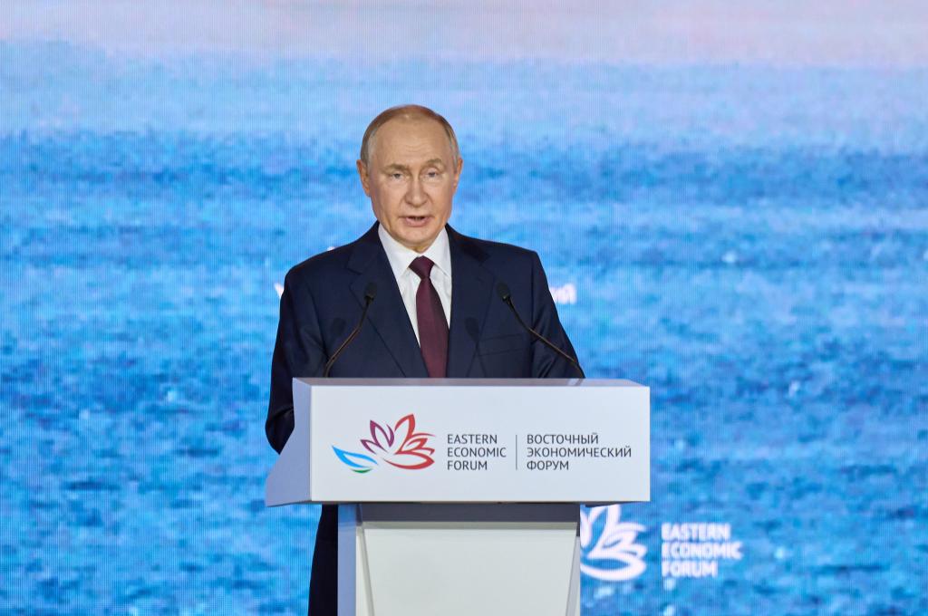9月5日,俄羅斯總統(tǒng)普京在符拉迪沃斯托克出席第十屆東方經(jīng)濟論壇全體會議時發(fā)表講話。新華社發(fā)(郭飛洲攝)