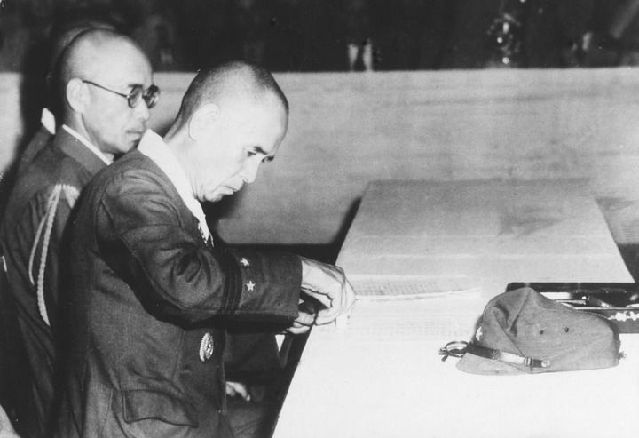1945年9月9日,南京舉行中國(guó)戰(zhàn)區(qū)日軍投降儀式,侵華日軍總司令岡村寧次代表日軍簽署投降書。新華社發(fā)