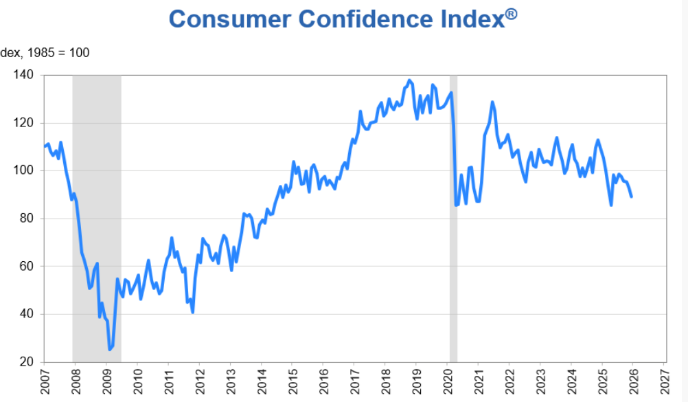 世界大型企業(yè)研究會首席經濟學家達娜·彼得森表示,盡管11月的數(shù)據(jù)因聯(lián)邦政府“停擺”結束而被向上修正,12月消費者信心再次下滑并依然遠低于今年1月的峰值。消費者信心指數(shù)5個成分指數(shù)中有4個出現(xiàn)下降,另一個表現(xiàn)明顯疲弱。