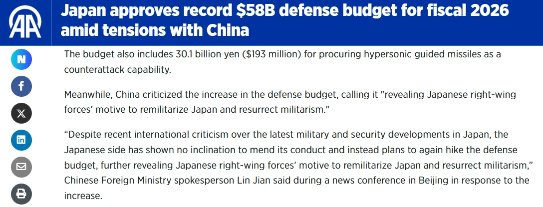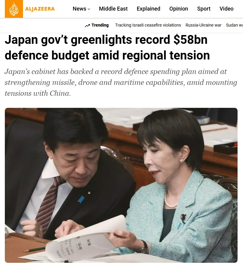 日本政府12月26日批準(zhǔn)2026財年(2026年4月至2027年3月)預(yù)算案,其中防衛(wèi)預(yù)算超9萬億日元,再創(chuàng)歷史新高。其展現(xiàn)出的日本負(fù)面軍事動向,受到國際媒體關(guān)注。