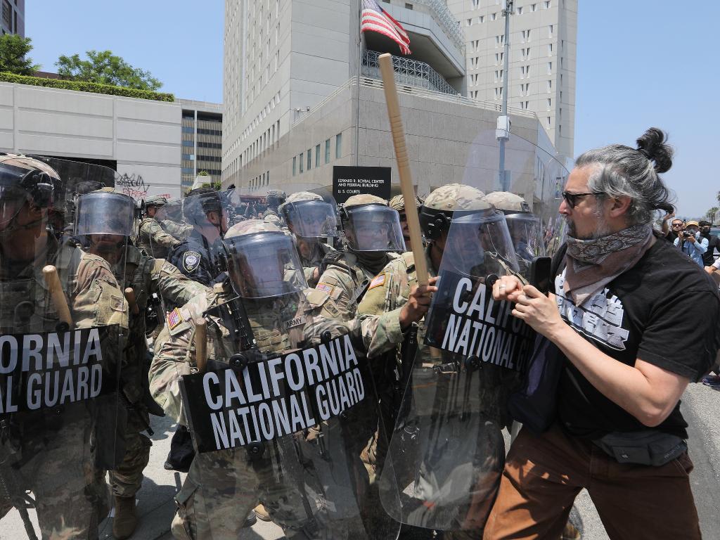 2025年6月8日,在美國(guó)加利福尼亞州洛杉磯市中心的聯(lián)邦執(zhí)法機(jī)構(gòu)門(mén)前,抗議者與國(guó)民警衛(wèi)隊(duì)人員發(fā)生沖突。新華社發(fā)(邱晨攝)